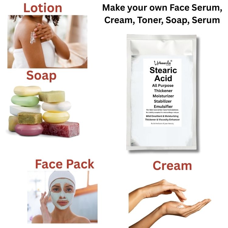 Urbaano Herbal Stearic Acid Flakes deliver multifunctional performance across cosmetics, pharmaceuticals, and industrial applications. This versatile fatty acid acts as a hardening agent, emulsifier, and lubricant, thickening soaps, candles, and lotions while stabilizing creams. In skincare, it imparts a luxurious pearly finish and enhances moisture retention for superior hydration.